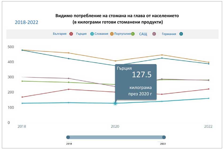 Видимо потребление на стомана на глава от населението – България, Гърция, Словакия, Португалия, САЩ, Германия 2018-2022 г.