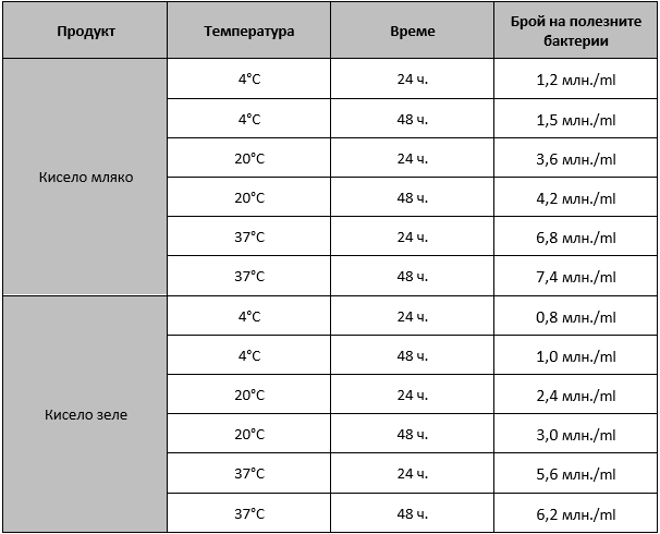 • Как се променя броят на полезните бактерии с повишаване на температурата и времето за всеки продукт?