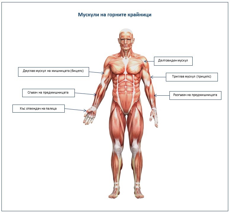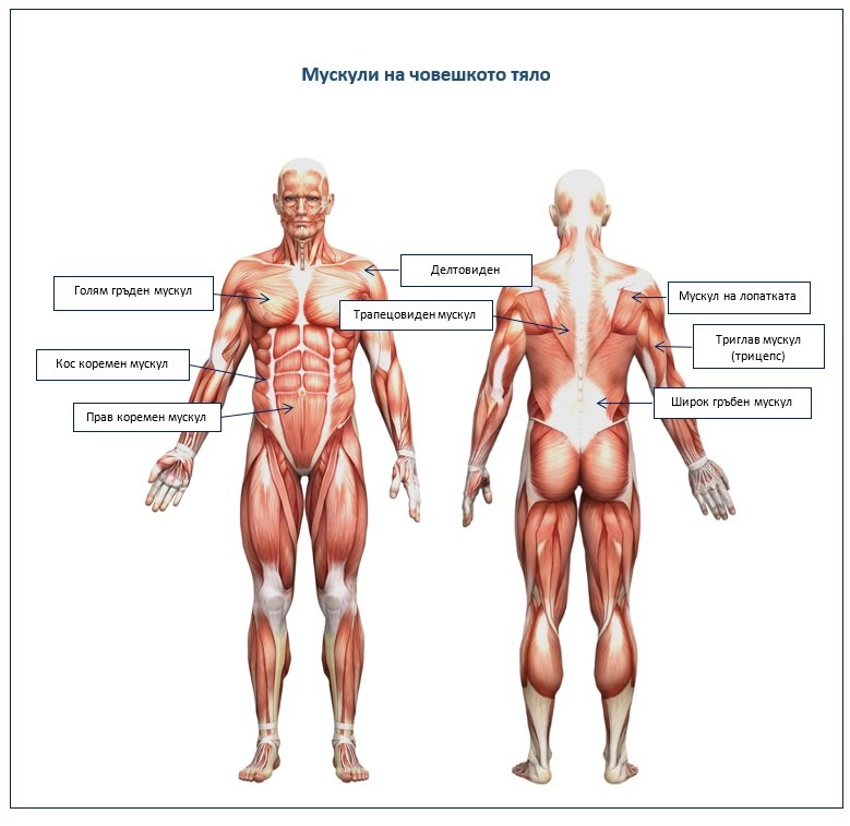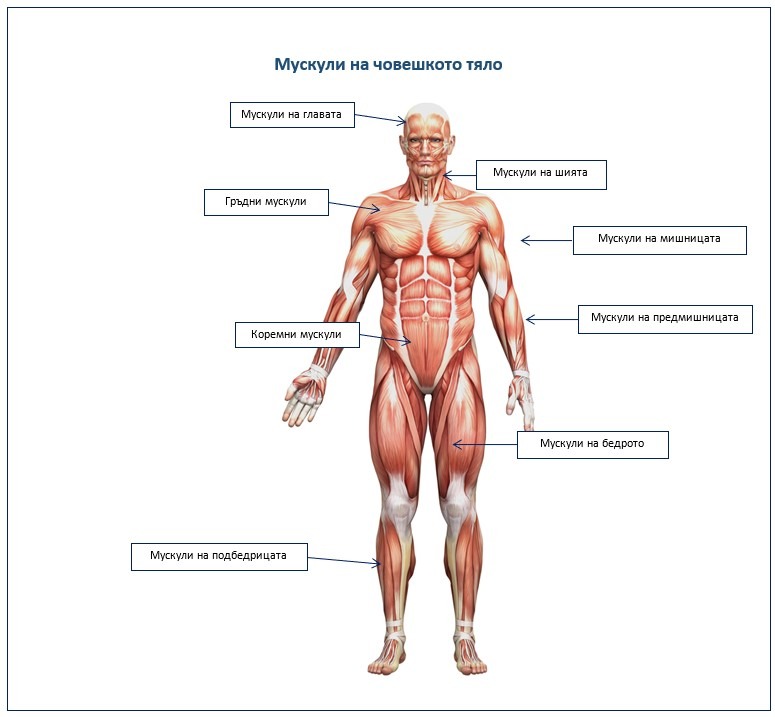 Мускулите са друга важна част от опорно-двигателната система. Те са свързани с костите чрез ставите и ни позволяват да се движим. Когато мускулите се съкращават и разширяват, те действат като двигател на нашето тяло. В зависимост от нуждите на движението, мускулите си сътрудничат или работят отделно.