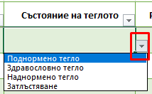 3. След това попълнете колоната „Състояние на теглото“, като имате право на избор между няколко опции. Тези опции се появяват след като отидете в клетка в колоната „Състояние на теглото“ срещу вашето име. Отдясно на клетката се показва бутон със стрелка (падащо меню), който ни позволява да избираме между четири опции за състоянието на нашето тегло. За да изберете вярната опция, е необходимо да използвате таблицата „Стойности“ и да прецените в коя категория попадате според вашия BMI резултат.
