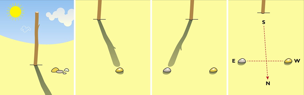| 1. Забийте пръчка в земята на равно място, осветено от слънцето. | 2. Поставете едното камъче в края на сянката, хвърлена от пръчката. | 3. Изчакайте около 15-20 минути и вижте как се е изместила сянката. Поставете второто камъче в края на новата сянка. | 4. Свържете двете камъчета с линия – тя ще бъде ориентирана в посока изток-запад. Перпендикулярът, прекаран през средата на тази линия, сочи в посока север-юг. |