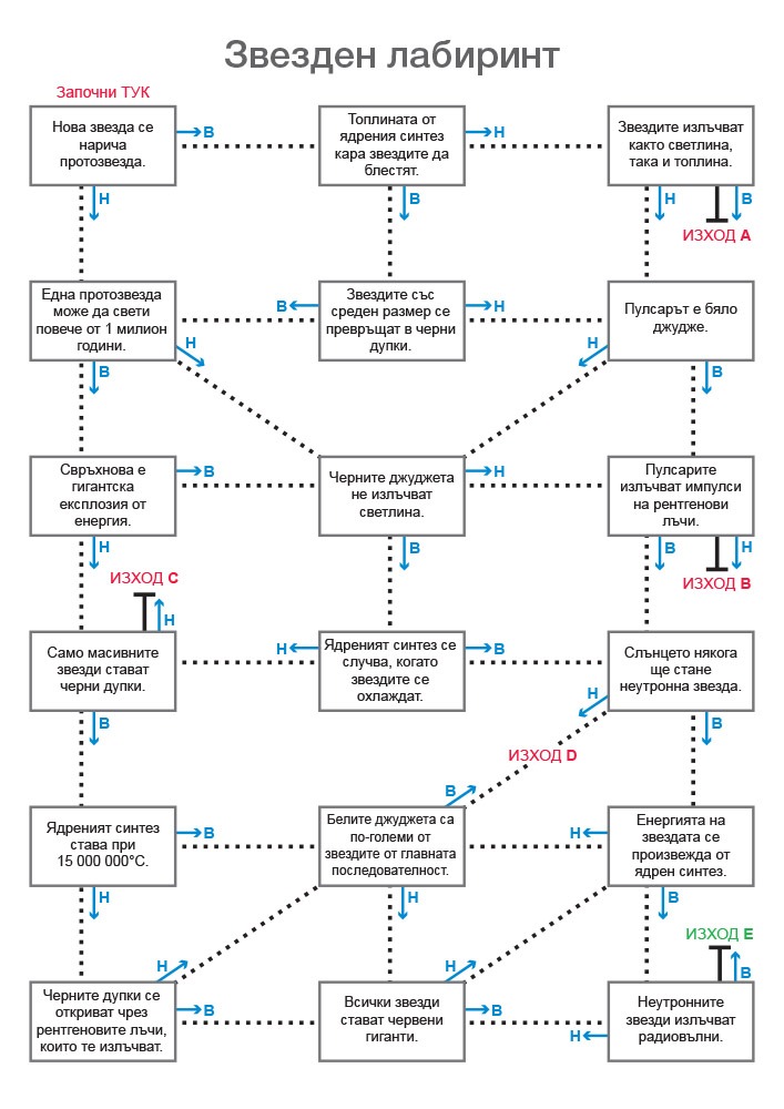 - Намерете верния изход от лабиринта, като внимателно четете всяко твърдение и избирате дали е вярно (В) или невярно (Н). В зависимост от това се придвижете (маркирайте пътя си с цветен молив) до следващата кутия с твърдение, като следвате указаната посока, докато стигнете изхода. Има само един верен изход – ИЗХОД E. Ако стигнете до някой от другите изходи, върнете се назад и проследете стъпките си, за да откриете къде сте сгрешили. Намерете вярната посока, успех!