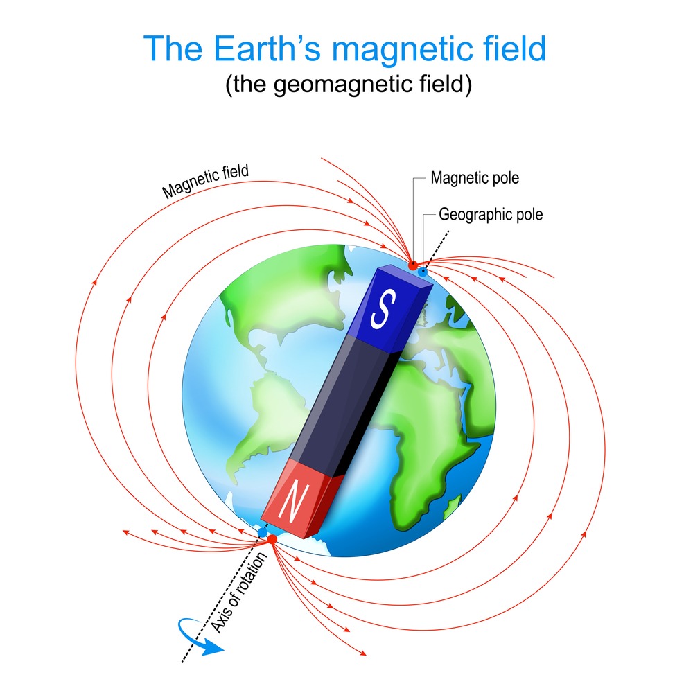 Магнитното поле на Земята може да се представи като полето на пръчковиден магнит, преминаващ през центъра на планетата. Магнитният и географският полюс на Земята обаче не съвпадат. Магнитните полюси не са фиксирани и се движат непрекъснато. Техните линии сключват ъгъл от около 120 спрямо оста на въртене на Земята, но той не е фиксиран и може да варира и да има различни стойности на различни места.