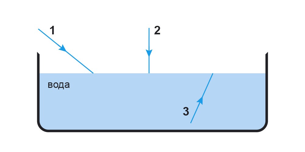 Задача 1. Светлинни лъчи 1 и 2 преминават от въздух към вода, а лъч 3 – от вода към въздух. Начертайте посоката на лъчите след преминаването им през водата.