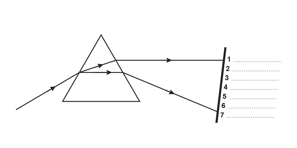 c. На схемата е показана стъклена призма, в която влиза бяла светлина. След като премине през призмата, бялата светлина се пречупва и разгражда на отделните си компоненти – наблюдаваме цветен спектър на светлината. Напишете имената на спектралните цветове за числата от 1 до 7.