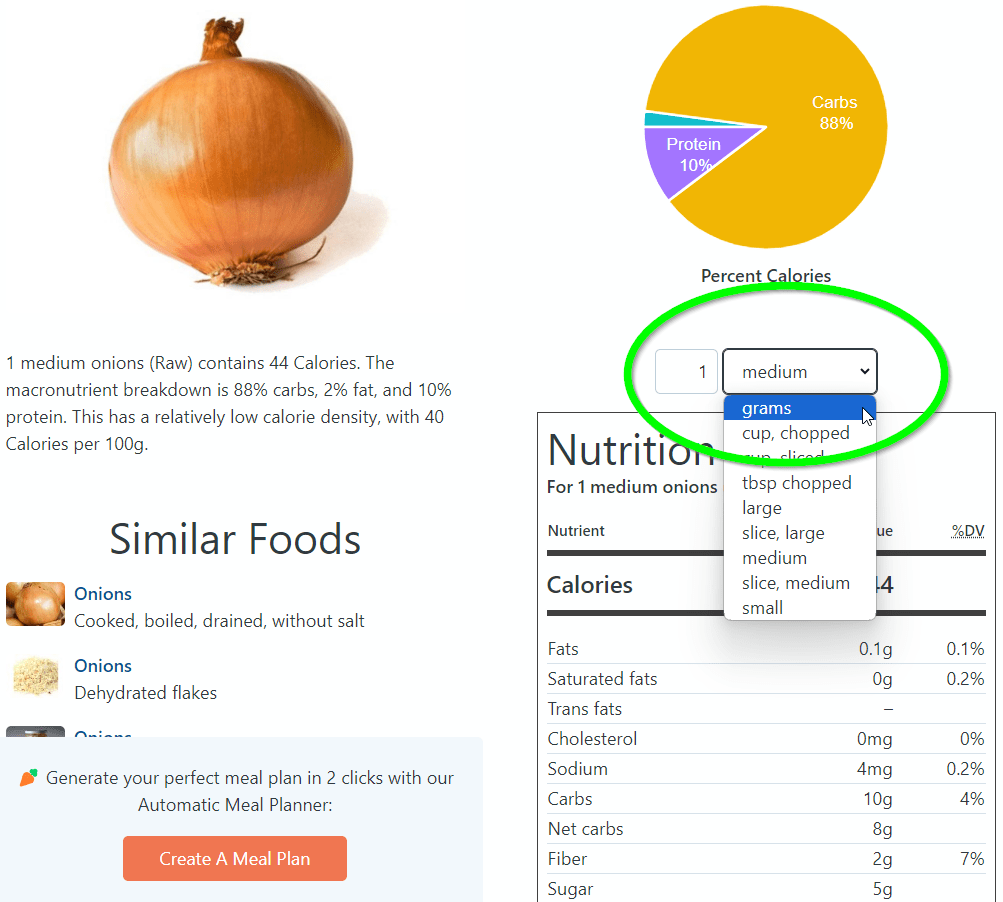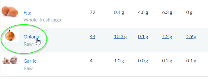 ПРИМЕР: Търсим „лук“. Той се появява в списъка с останали храни. Кликваме върху дадената храна: