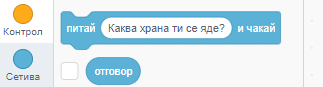 - Използва блокчета за въвеждане на текст и отговор от потребителя.