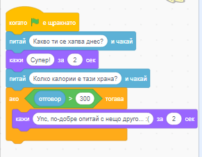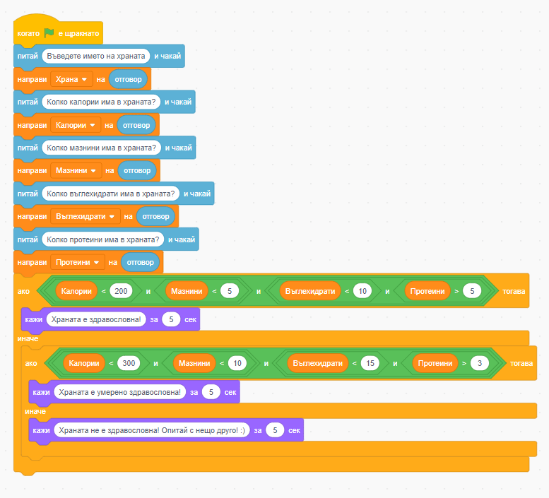 - Създаване на условни логики: Използвайте блокчета „ако-тогава“, за да определите дали храната е здравословна.