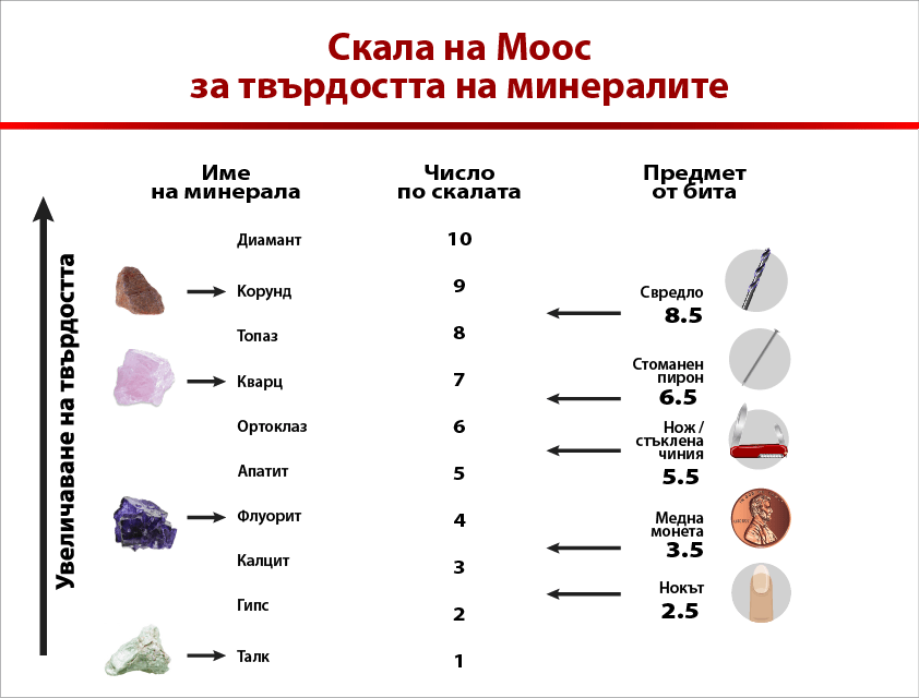 - Анализирайте самостоятелно данните от скалата на Моос, показваща твърдостта на 10 еталонни минерала.