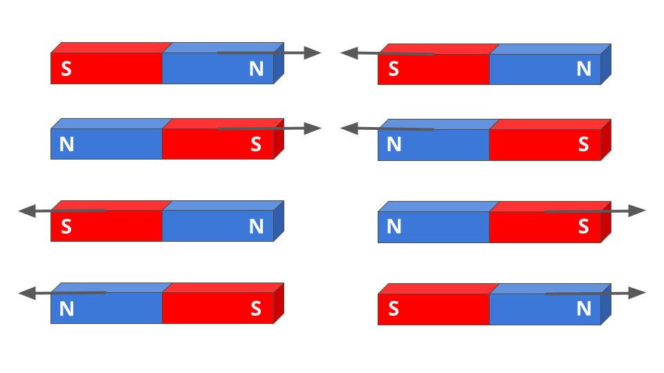 - Противоположните (разноименните) магнитни полюси се привличат, а еднаквите (едноименните) се отблъскват. Северният полюс на един магнит се привлича от южния полюс на друг магнит.